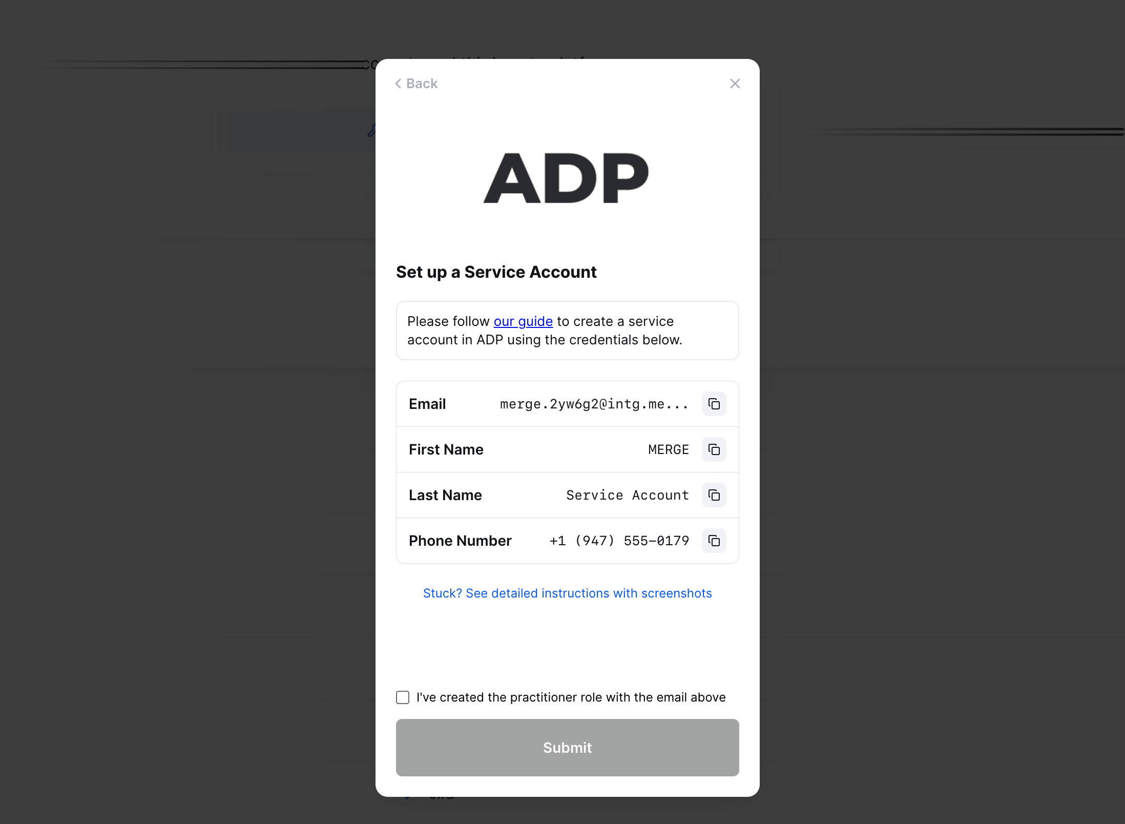 - When that is all completed, return to the Dado integrations page and click on the ADP non-API card again