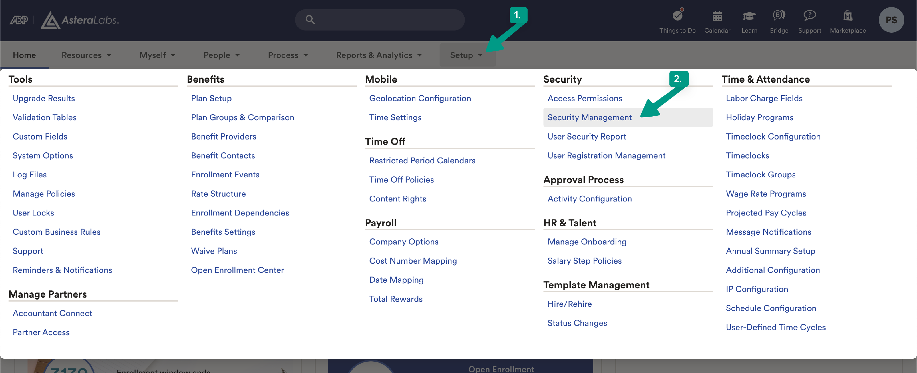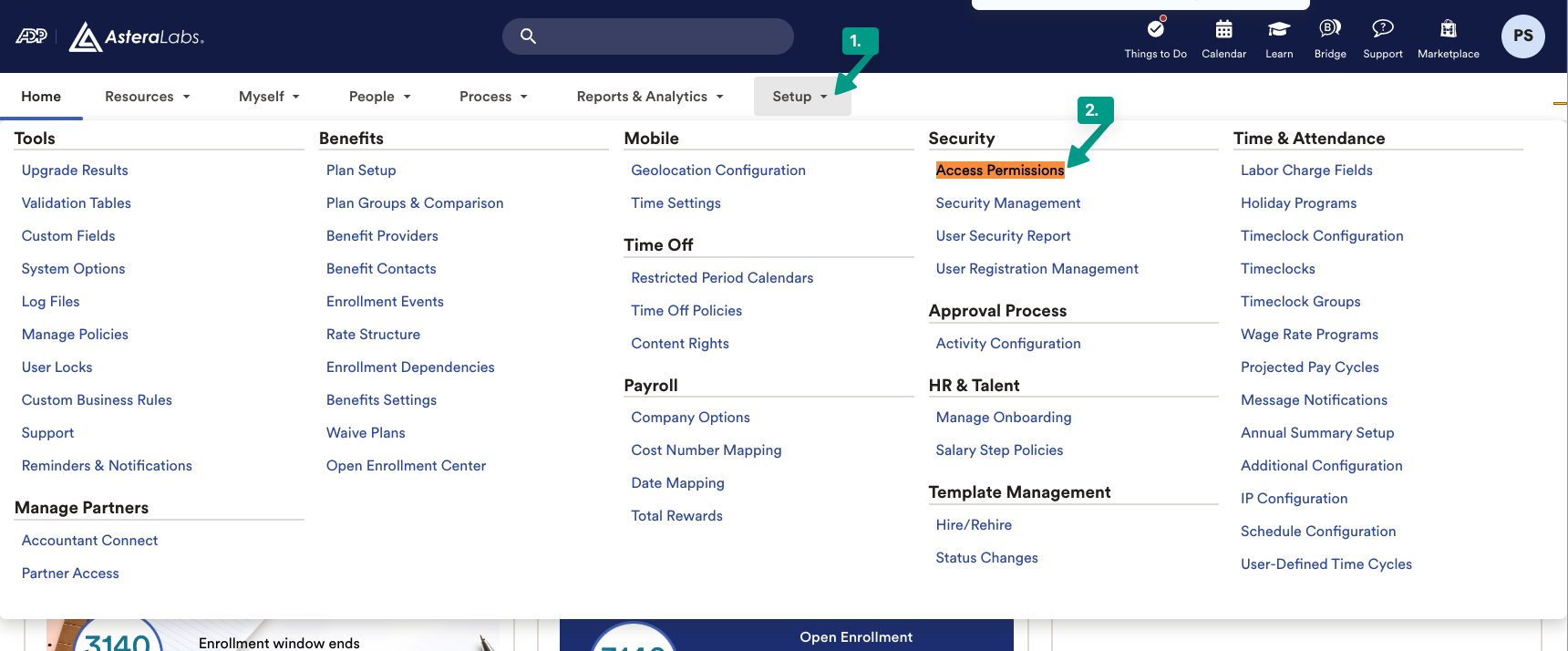 1. In your ADP Workforce Now account, go to Setup and find Access Permissions.