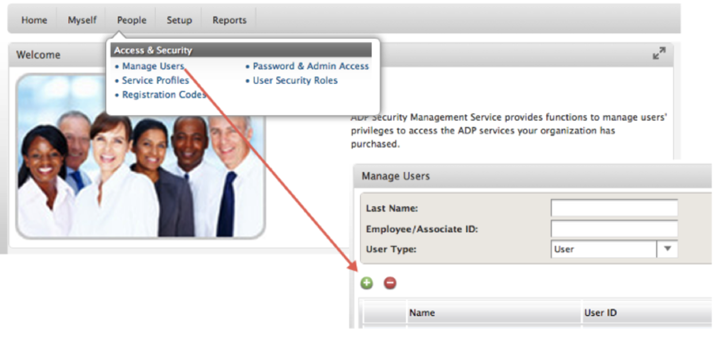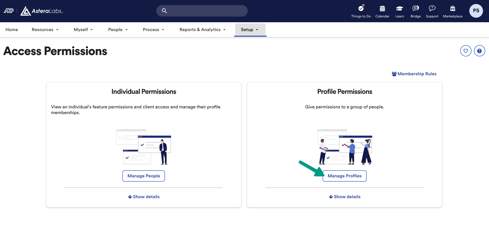 - In your ADP Workforce Now account, go to Setup and find Access Permissions, then go to the Manage People page