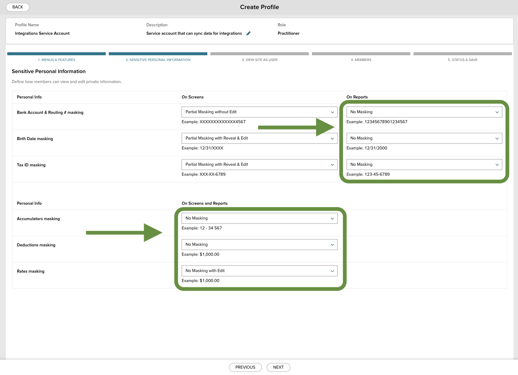 In Sensitive Personal Information, go to On Screen & Reports and On Reports, and from the drop down menu select No Masking next to Birth Date masking. This will allow the service account to securely sync birth dates to Dado.