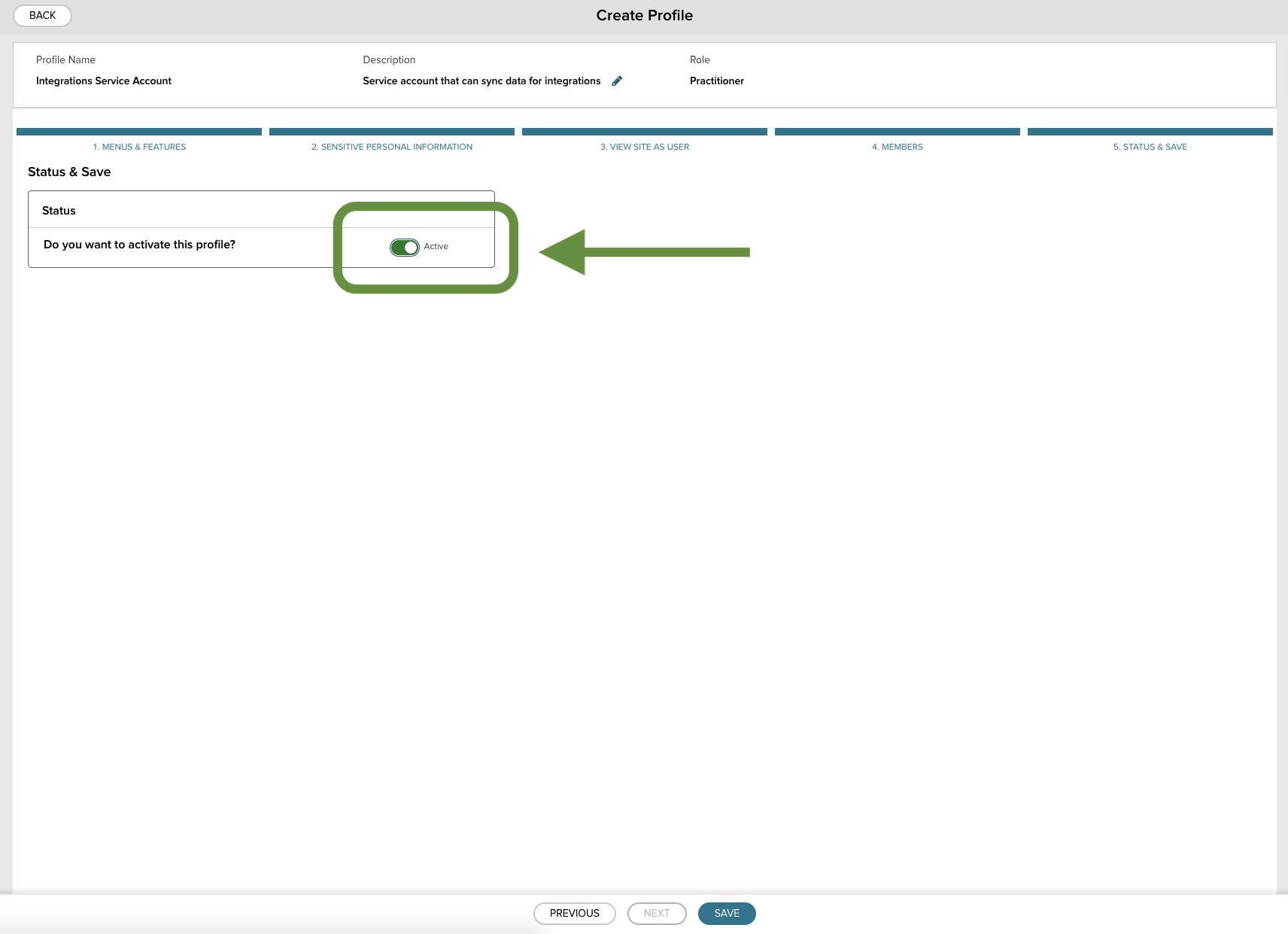 On the last screen, Status & Save, activate the profile, and then save it by pressing the blue button at the bottom