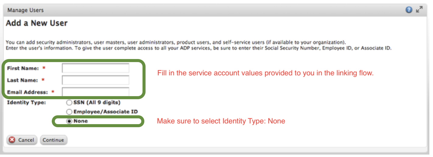 - Step 3. Create a new ADP user and assign it to your "Integration Services Account" profile