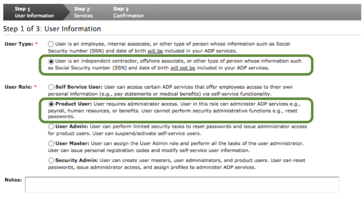 In Step 1 "User Information", set the User Type to the “user is an independent contractor...” option, and set the User Role to “Product User”.