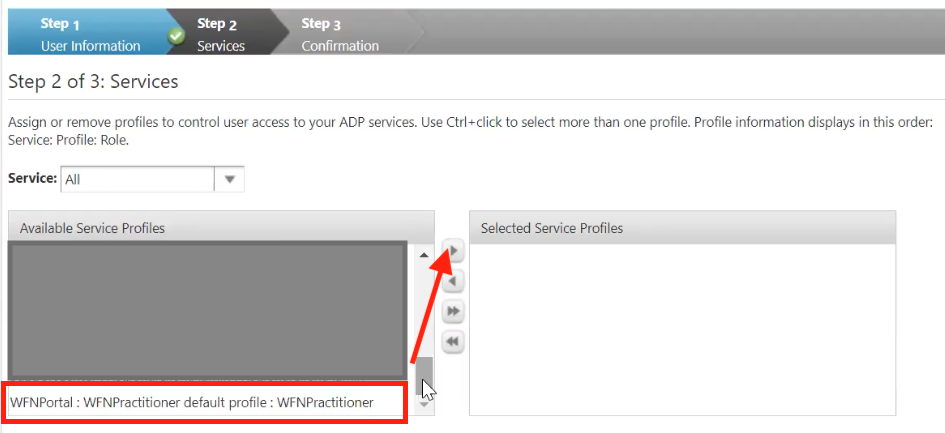 Assign the profile by selecting WFNPractitioner in the "Available Service Profiles Box" and moving it to the "Selected Service Profiles"