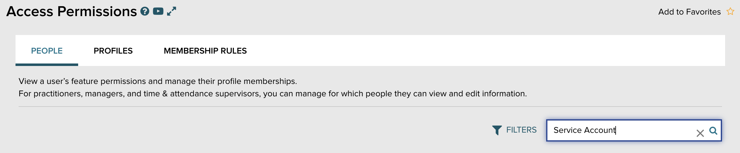 Go back to your Workforce Now portal, and go to the Access Permissions page like before to find the Manage People page. Search for 'Service Account' to pull up the new user ('Service Account' should be the user's last name)