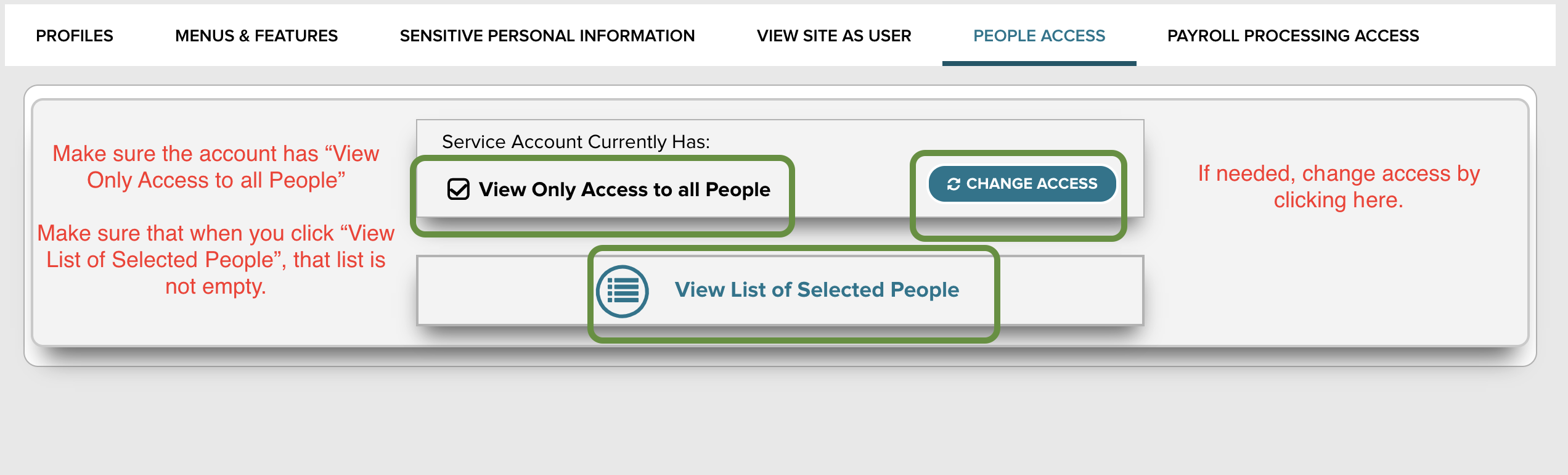 Lastly, in People Access, under Service Account Currently Has, check off View Only Access to all People. Click View List of Selected People, and make sure that list is not empty. This is needed to view employees (including terminated)