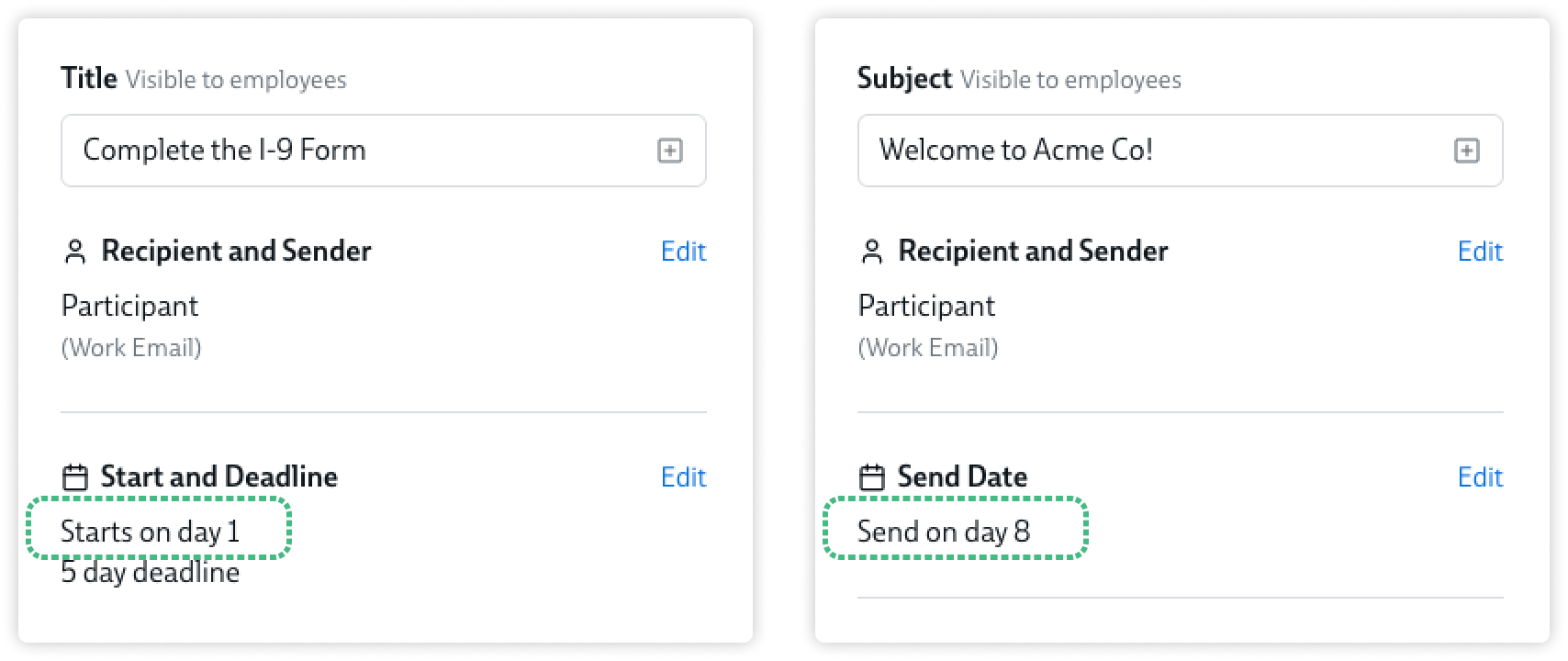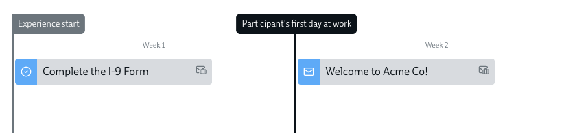 - "Welcome to Acme Co!" starts on Day 8 of the experience – ie, a full week after the start