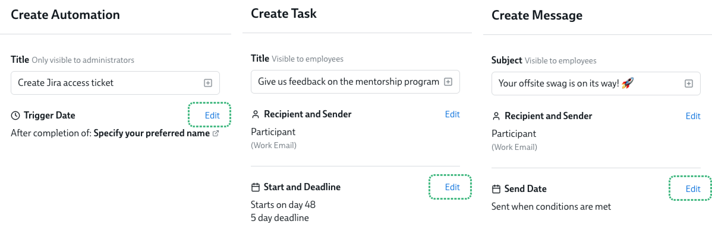 To configure when your Task/Message/Automation starts, open up the Task/Message/Automation in the 'edit' mode of your experince. In the left hand column, you'll see a section for the Start, Trigger or Send date. Click Edit.