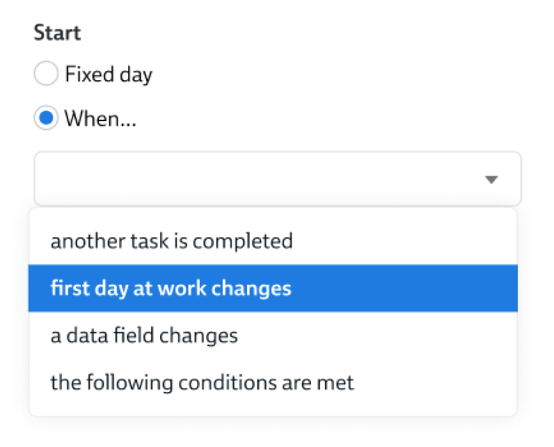 When you set up your experience to trigger based on a milestone date (such as birthday, anniversary, first day at work, last day at work), you will see an extra option in the start triggers, that references your milestone date:
