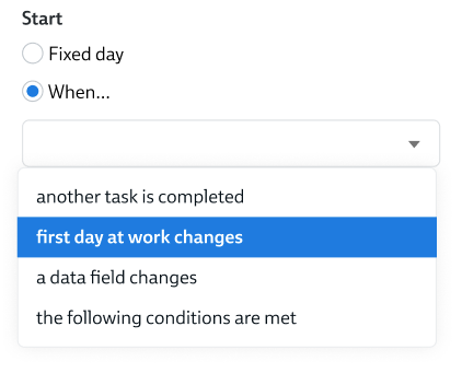 Click Edit and then When, and you'll see three options for data change-triggered starts, as well as the option to start the Timeline Item when another task completes.