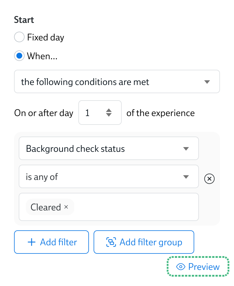 - When the following conditions are met – for instance, when the "Background Check Status" field contains "Cleared"