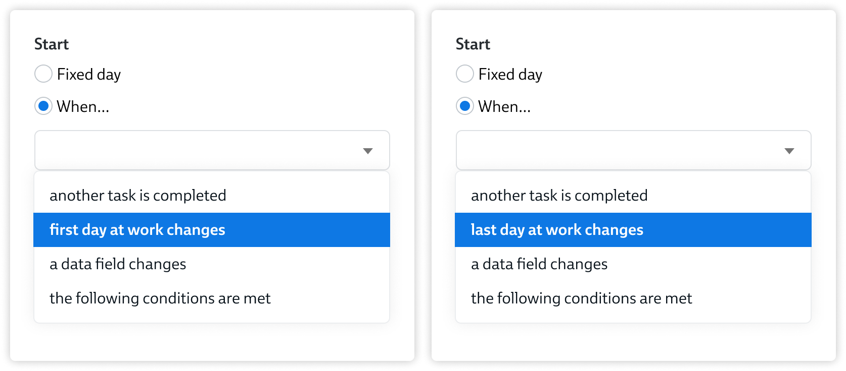 This start trigger option works exactly the same as the "When a data field changes" option, so please reference the section above for full details.