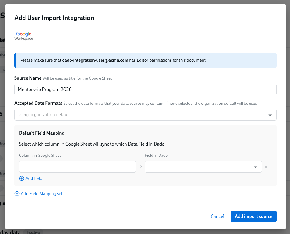 - You must include at least one email address in your field mappings. Without an email address, Dado will not be able to create new users or update data for existing users.